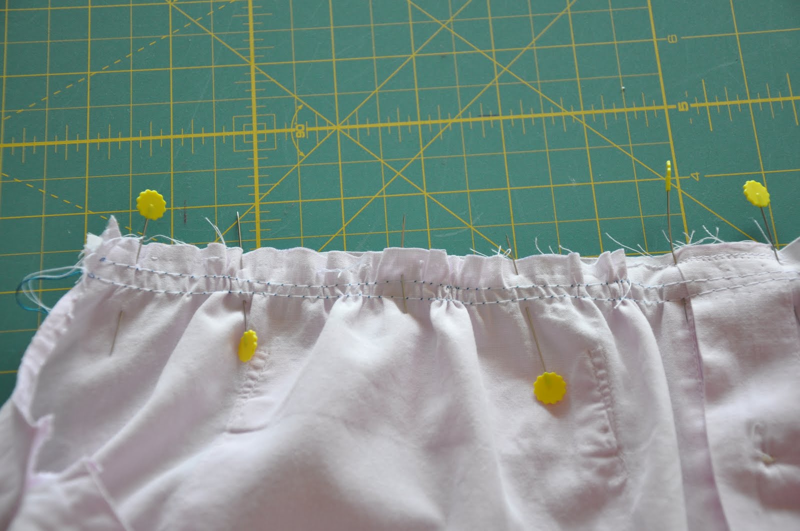 5 - Rivoltare sul diritto la gonna. Con un pennarello per stoffa o una matita, segnare due linee verticali, ai lati del punto centrale indicato con uno spillo, e tagliare formando due asole.